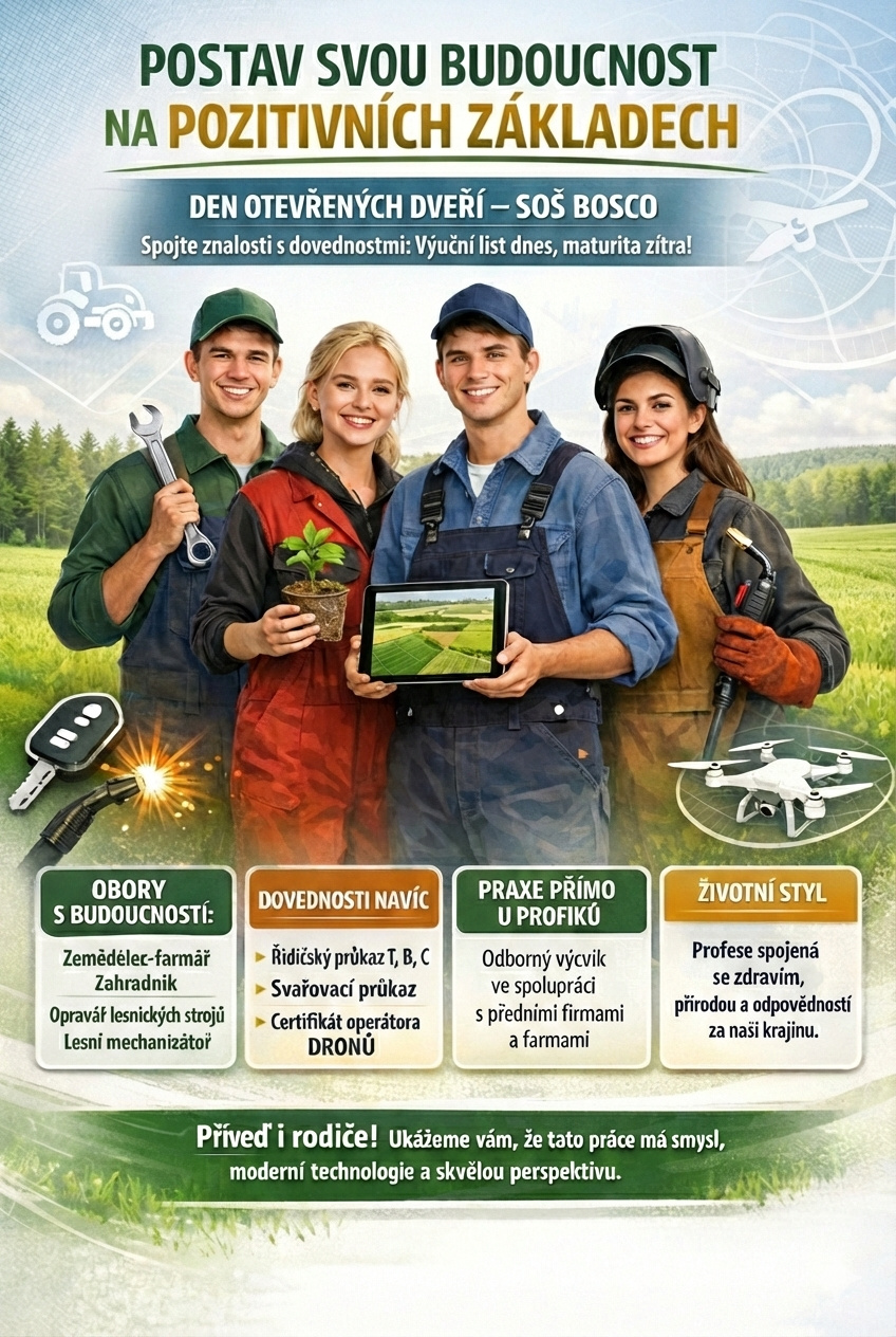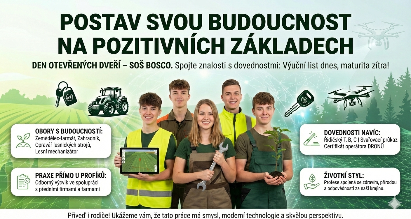 Přijďte se podívat, jak propojujeme teoretické znalosti s praktickými dovednostmi a jak připravujeme studenty na budoucnost v oblastech zemědělství, lesnictví, zahradnictví a technických oborů. Naši učitelé i studenti vám představí učebny, dílny, školní pracoviště, domov a zázemí, kde vznikají skutečné dovednosti pro život.